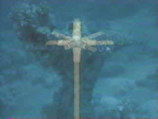 Above, chariot wheels fixed to axels standing at attention on the seabed.
