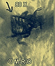 “Three months to the day, I felt as though I was being bitten all over again! I was screaming in horror and pain and could see nothing attacking me. After careful examination, my husband could see crystals sticking out of my back! He removed several of them with tweezers — they were all alike: triangular in shape, with one side serrated the other two rather straight, and all had either a black or red dot in the center. Once the crystal was removed the pain ceased immediately. Along with some of these crystals pieces of black material also was removed to find later that they were actually pieces of an insect’s leg. This cycle happened like clockwork every 3 months, leaving behind scars of white pox-like marks, red striated lines, red dots, and tender skin.