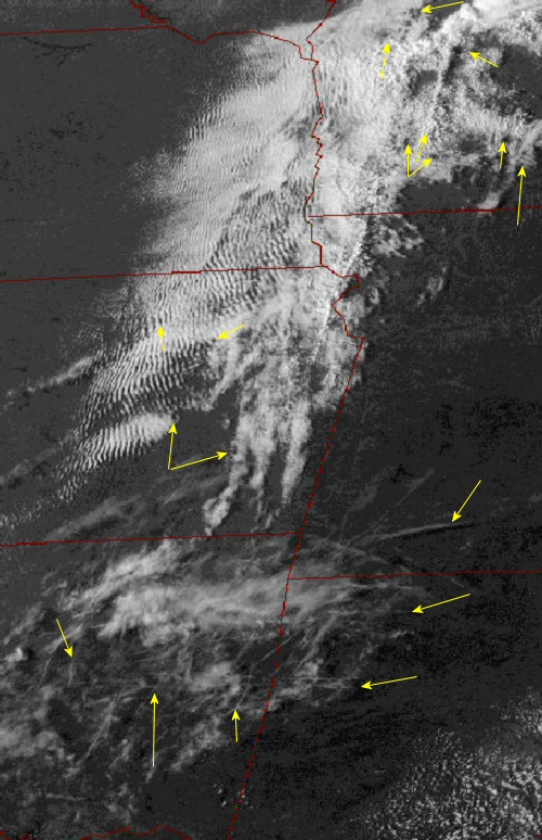 Hundreds of miles of rippling clouds across Kansas and eastern Nebraska countering/working against a strong southerly low level flow of heat and moisture ahead of an inbound fall storm from the north Pacific. Gently nudging the storm in a slightly different direction as compared to what would happen naturally. Note the prolific marking contrails from the Ozarks of Missouri/Arkansas and all of eastern Oklahoma.