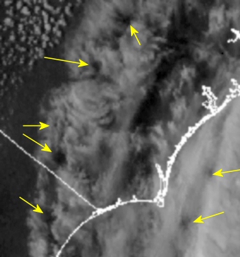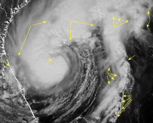 Exceedingly unusual shapes/patterns found in the western cirrus shield of Ophelia as she churned off the South Carolina coast. Does anybody else see these unusual holes? I haven't pointed out nearly all that is odd within this image either!