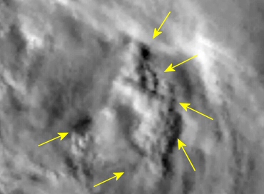 Additional classic scalar geometry is seen within the eye of this category one hurricane. More holes used to make a square which will deform to make an eye like feature. Do you see the developing track that will connect the two westernmost arrowed holes?