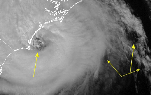 This was just as Ophelia was tracing the exact path of the North Carolina coastline. And I do mean she moved from Myrtle Beach, South Carolina to Southport/Wilmington, N. C. up to Morehead City before pausing. The precision of this movement is a clear demonstration of what these guys are capable of! Do you see the anti-eye, it is arrowed and well off the the east?