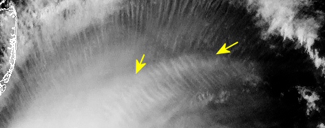 Roughly seventy-five to 90-degree bends in the high level cirrus outflow highlight the gravity waves/scalar waves of energy fields to maintain the upper level outflow and hence the angular momentum of the storm.