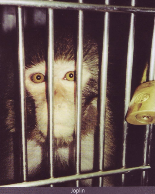 Although the sheer number of monkeys made it impossible to get to know more than a handful of them personally, I am privileged to have had the chance to get to know a few of them and it's very important that I share with you another individual's story. I called her Joplin, but to the researchers she was known only as monkey number 20600. She was stolen from the wild and shipped from Beijing with a shipment of 100 other Chinese-origin rhesus macaques to the US. These monkeys were unlike any of the other captive-bred macaques I was familiar with. They were lean and well muscled with faces suntanned from an active life outdoors. They were totally naive to the cage and were completely bewildered, literally smashing from one side of the cage to the other in a desperate attempt to escape.
