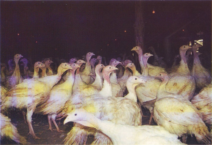Most turkeys live crammed together in dimly-lit windowless sheds. 25,000 in one shed is typical of the bigger units. Though not caged, turkeys nearing slaughter weight have little more floor space to themselves than a battery hen. Moving around the shed becomes a stressful challenge and the overcrowding induces aggression. Some, reared especially for the Christmas trade, are kept in 'pole barns', in natural daylight. These may have a little more room, but are still kept in grossly overcrowded conditions.Cannibalism