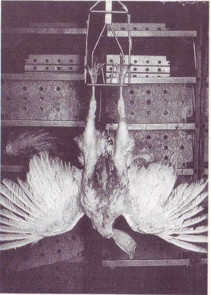 Turkeys are large, strong and easily frightened. Violent treatment of birds occurs when catchers move in to grab the terrified birds by the legs. They're then forced into crates or modules so roughly that a major cause of downgrading at the slaughterhouse is bruising. Inevitably, some die en route to the processing plant.Turkeys are killed in the same way as chickens. They suffer greatly at slaughter. Very heavy, (a male adult can weigh as much as an 8-9 year old child) and often diseased, enormous strain is put on legs and hips as birds hang upside-down in shackles, To add to the misery, trailing wings often touch electrically live waterbath ramps, causing painful and terryfying pre-stun shocks. Research has shown that many slaughter-houses fail to cut birds' necks properly, so delaying merciful brain death. Every year, thousands of British turkeys enter the scalding tank alive, perhaps conscious.